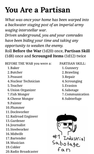 Take on the roll of scrappy partisans piloting a shoddily welded-together mech into battle in this 5 page TTRPG for 2-6 players.